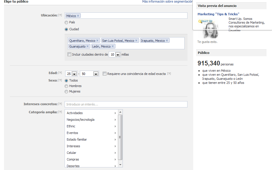Es uno de los puntos más fuertes de la publicidad en Facebook. Se puede segmentar por criterios: